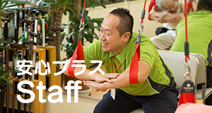 「明るく、楽しく、元気に!!」を合い言葉に、当施設は機能訓練を主にしたサービスを行います。安心プラス・安心プラス下三栖は、皆様の在宅での日常生活をより長く続けていただくと同時に、より価値あるものにするため、お客様のニーズに合わせ、専門家(理学療法士・作業療法士・看護師・柔道整復師・・他)が、実生活でより自立に効果的な機能訓練を目指します。